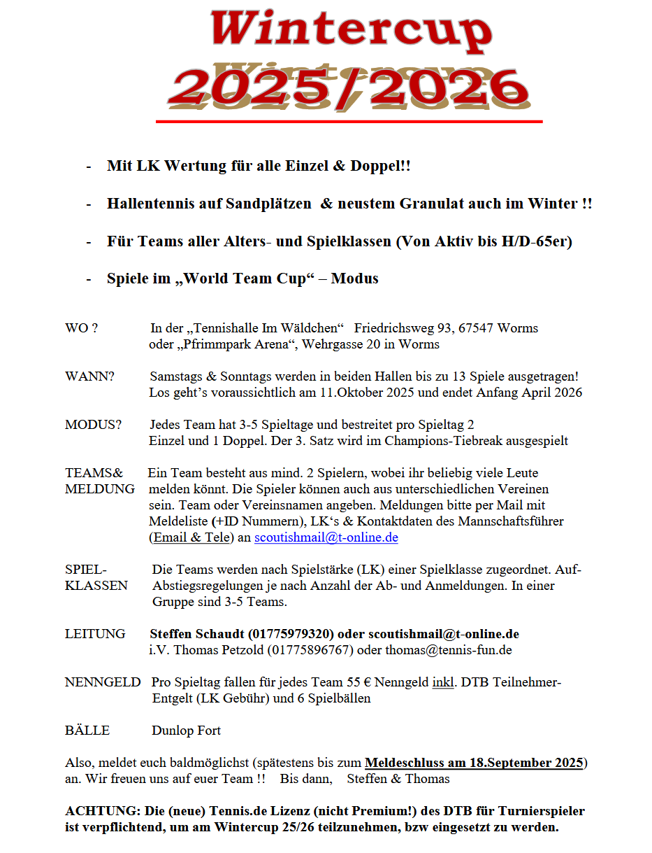 Ihr könnt euch für den Cup auch mit euren Tenniskollegen/-kolleginen anmelden, die nicht aus dem gleichen Verein stammen. Ihr braucht nur einen Teamnamen, eine Meldeliste mit LK's und Kontaktdaten des MF an scoutishmail@t-online.de schicken und schon seid ihr dabei.